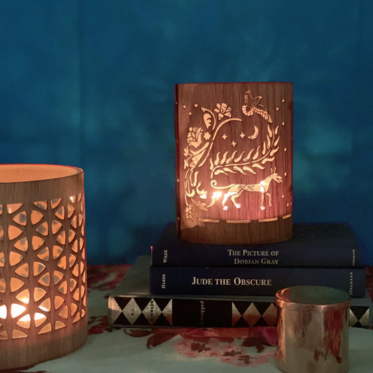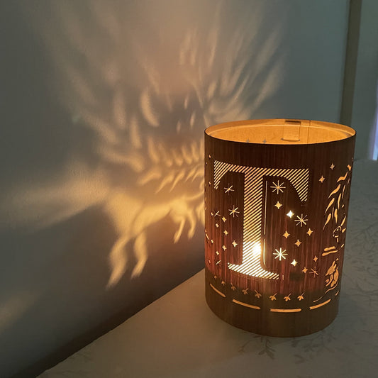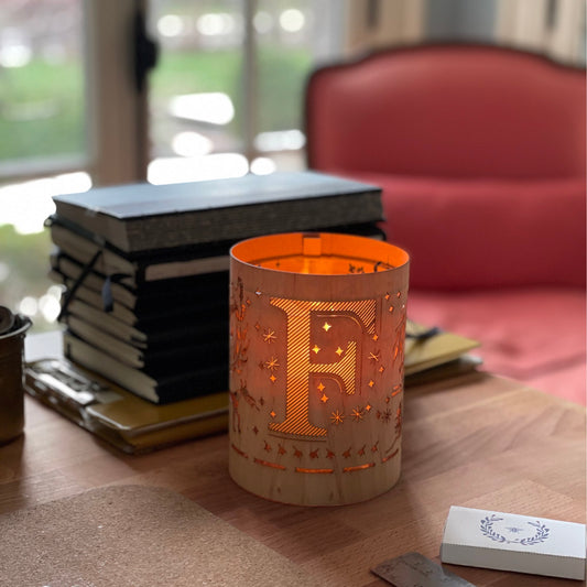 Decorative monogram letters are great way to glam up an office, the bedside or bathroom with just the right touch of personality and a lantern is even better, Our lanterns is has the carved letters created by slicing the wood at an angle to reveal the light and yet maintain the structural integrity of the cozy. Carving initials in wood this way allowed for a very large initial for some real drama.