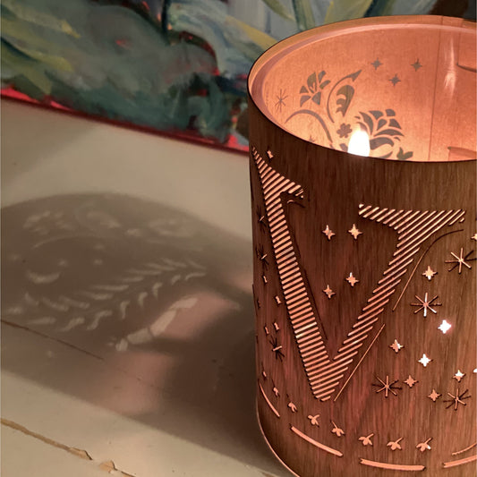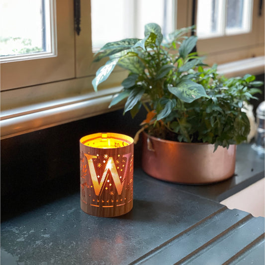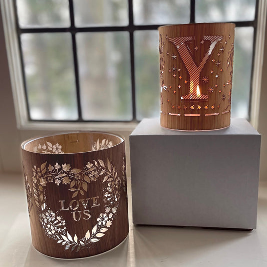 Decorative monogram letters are great way to glam up an office, the bedside or bathroom with just the right touch of personality and a lantern is even better, Our lanterns is has the carved letters created by slicing the wood at an angle to reveal the light and yet maintain the structural integrity of the cozy. Carving initials in wood this way allowed for a very large initial for some real drama.
