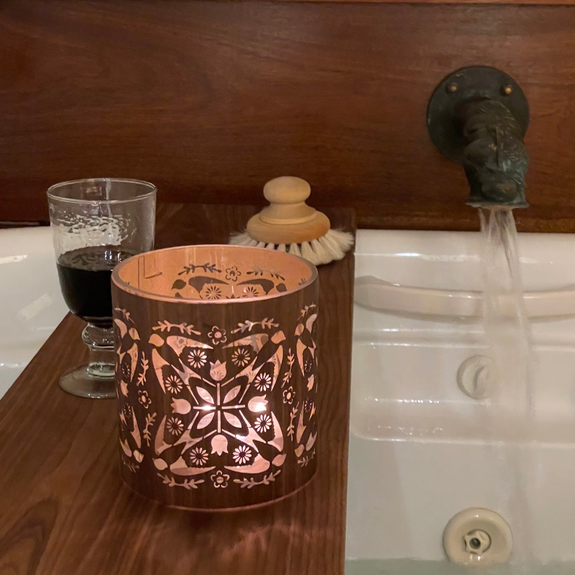A candle holder with tulips and swallows to welcome spring