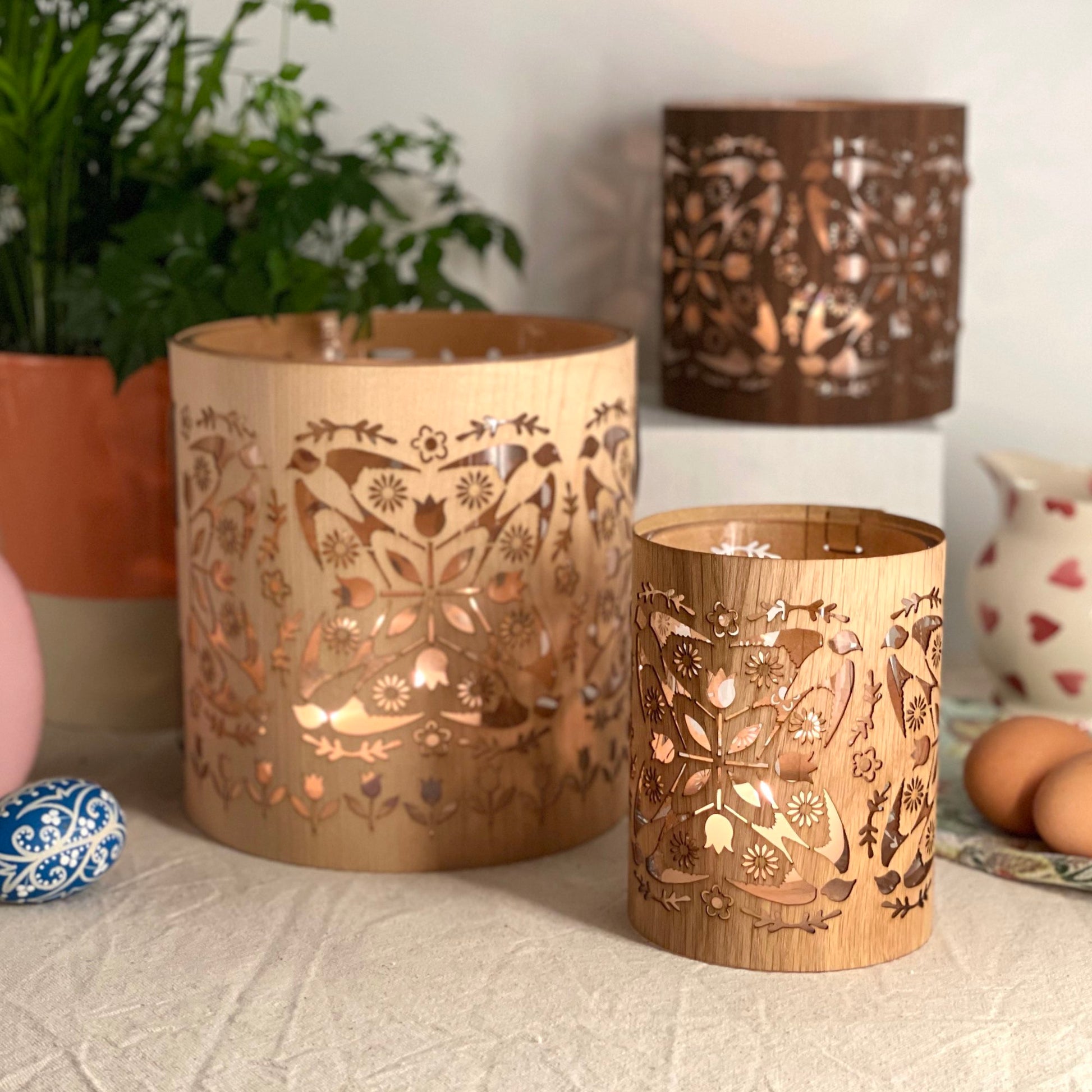 This wonderful repeating pattern was inspired by the returning birds and the spring flowers bursting forth, it's like bringing the garden indoors. The little cutwork flowers and leaves create the most beautiful detail of light and this design is so versatile it works well in all three woods and sizes.